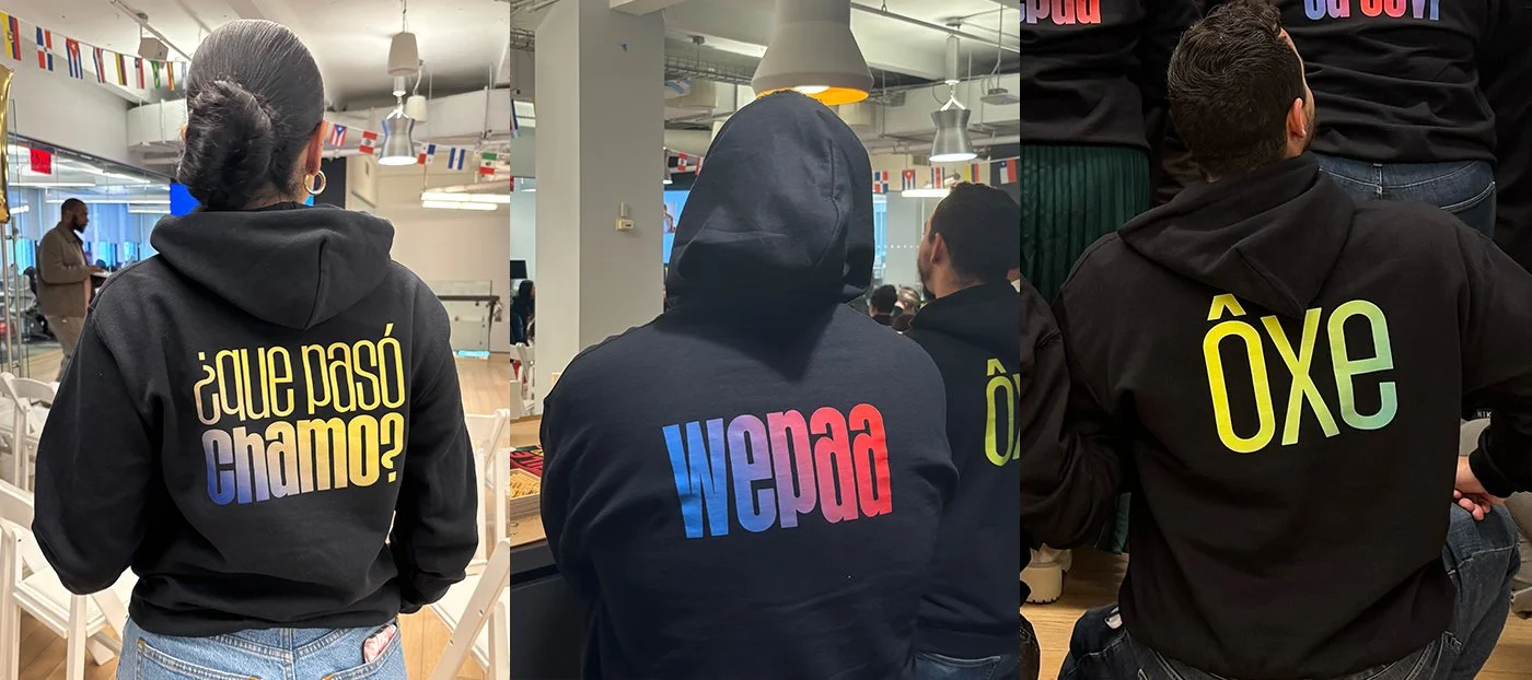 The logo draws inspiration from Earth and morphs into sub logos for each one of the Latin countries. The identity came to life in hoodies with phrases from each country.